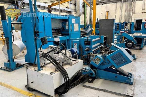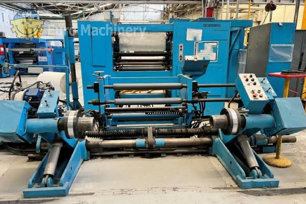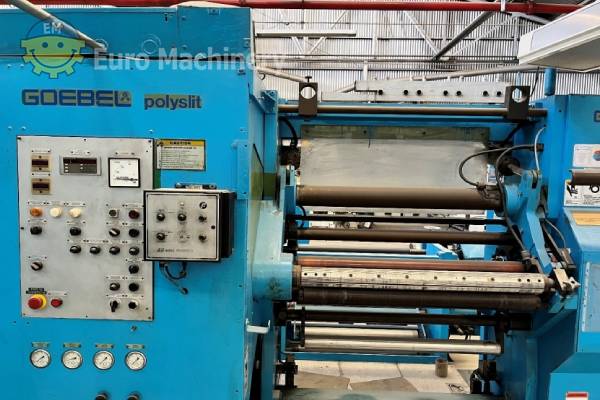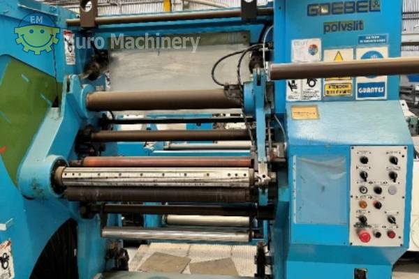 GOEBEL Polyslit skæremaskine til opspoling af aluminium, film og papir. Denne spolemaskine kan skære fra 50 mm til 800 mm med en arbejdshastighed på 800 m/min. Mærke og model: GOEBEL POLYSLIT Materiale til at skære: Aluminium, film, papir Spaltebredde: Min 50 mm – max 800 mm Tykkelse min-max: 0,009 – 0,051 mm Afvikler:- Maks. rullediameter: 1.100 mm